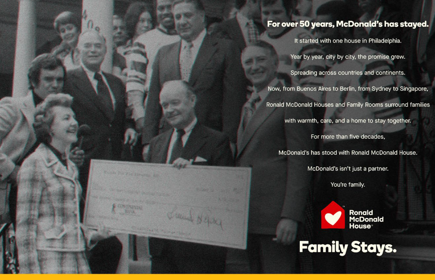 McDonald’s is the charity’s first corporate partner and advocate, earning the designation: “founding and forever partner.” From the moment we opened our first Ronald McDonald House in 1974, McDonald’s employees, franchisees, suppliers, and customers worldwide have shared donations as well as their talent & time to support the Ronald McDonald House mission.